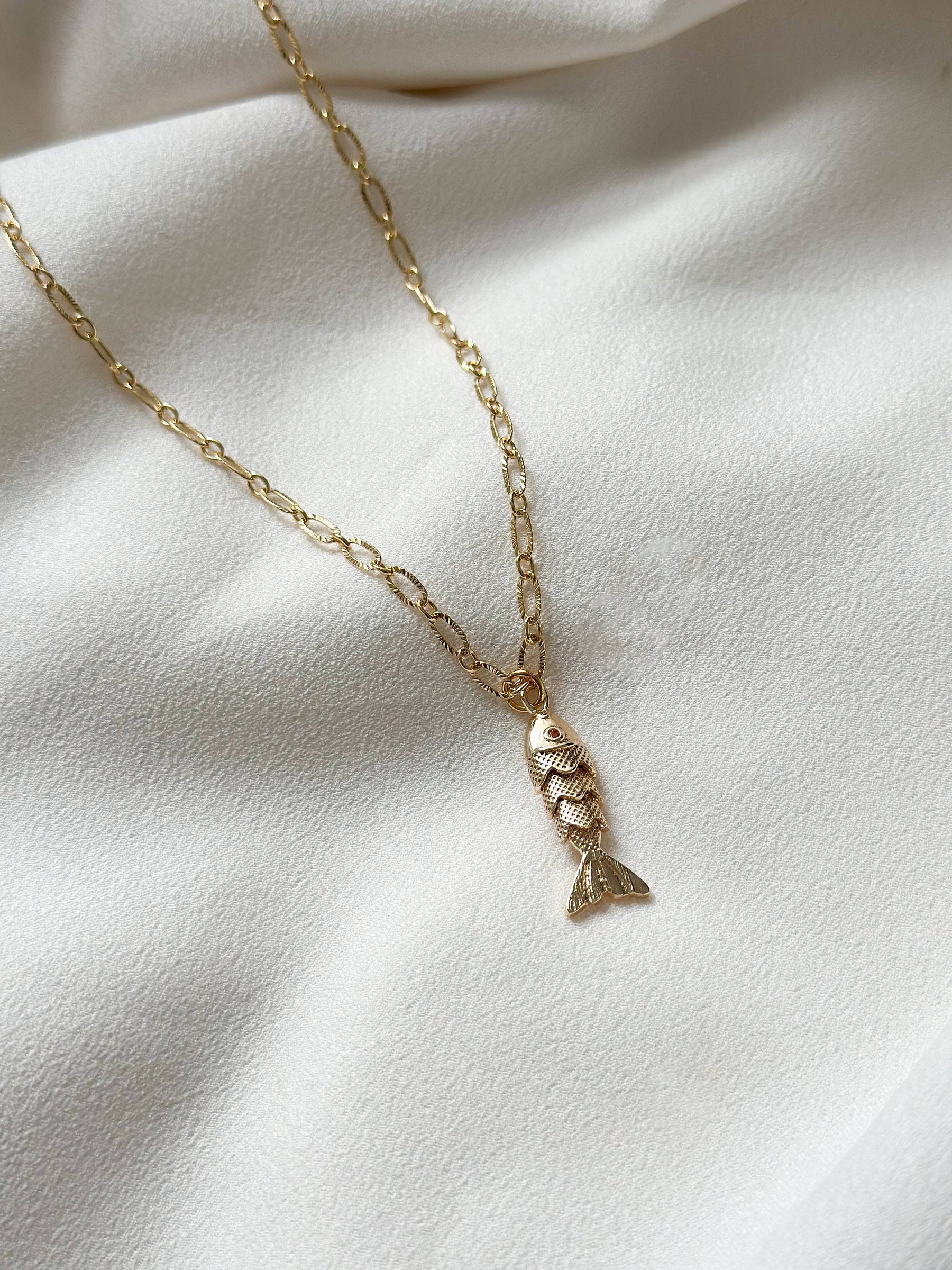 18k gold necklace link style chain with and fish pendant.