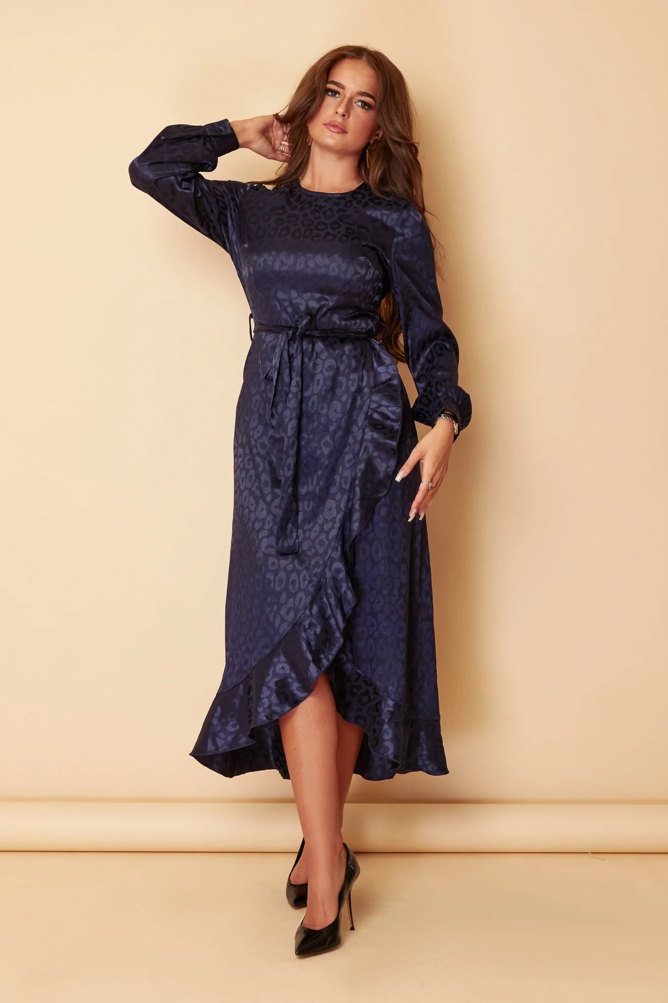 Have all eyes on you in this unreal dress. Danica Navy Leopard Frill Skirt Long Sleeve Midi Dress features a frilled skirt, a waist belt to accentuate your figure and a gorgeous satin material. Add simple jewellery and a pair of heels to complete the look.