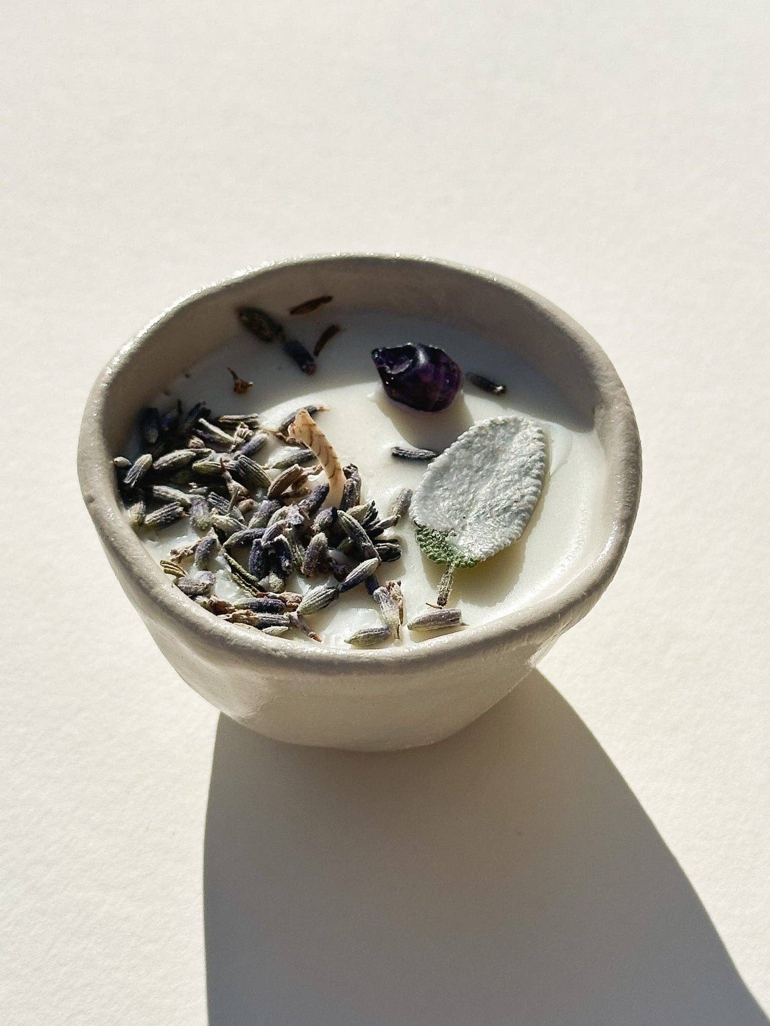Topped with an amethyst, known for their calming properties, English lavender and clary sage.