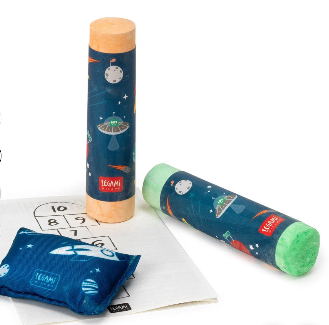 Hop to it! Rediscover Hopscotch, a timeless, vintage game. The reusable metal box contains a bean bag and 2 pieces of coloured chalk. Whether you play indoors or outdoors, remember to always follow the rules!