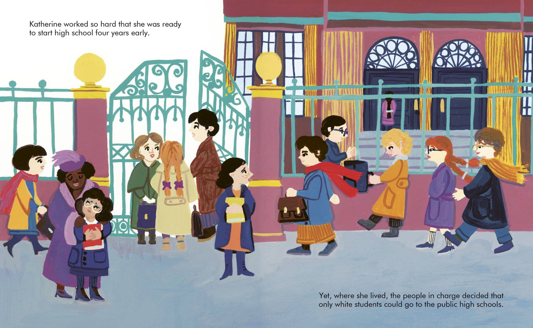 Little Katherine loved learning and her favourite subject was maths. In class, she worked so hard that she was able to move up to high school four years early! Due to the racist laws of the time, Katherine's family had to move town for her to go to a school where Black students were admitted. After high school and college, she was accepted to one of West Virginia's top universities and was the first Black woman to attend.
