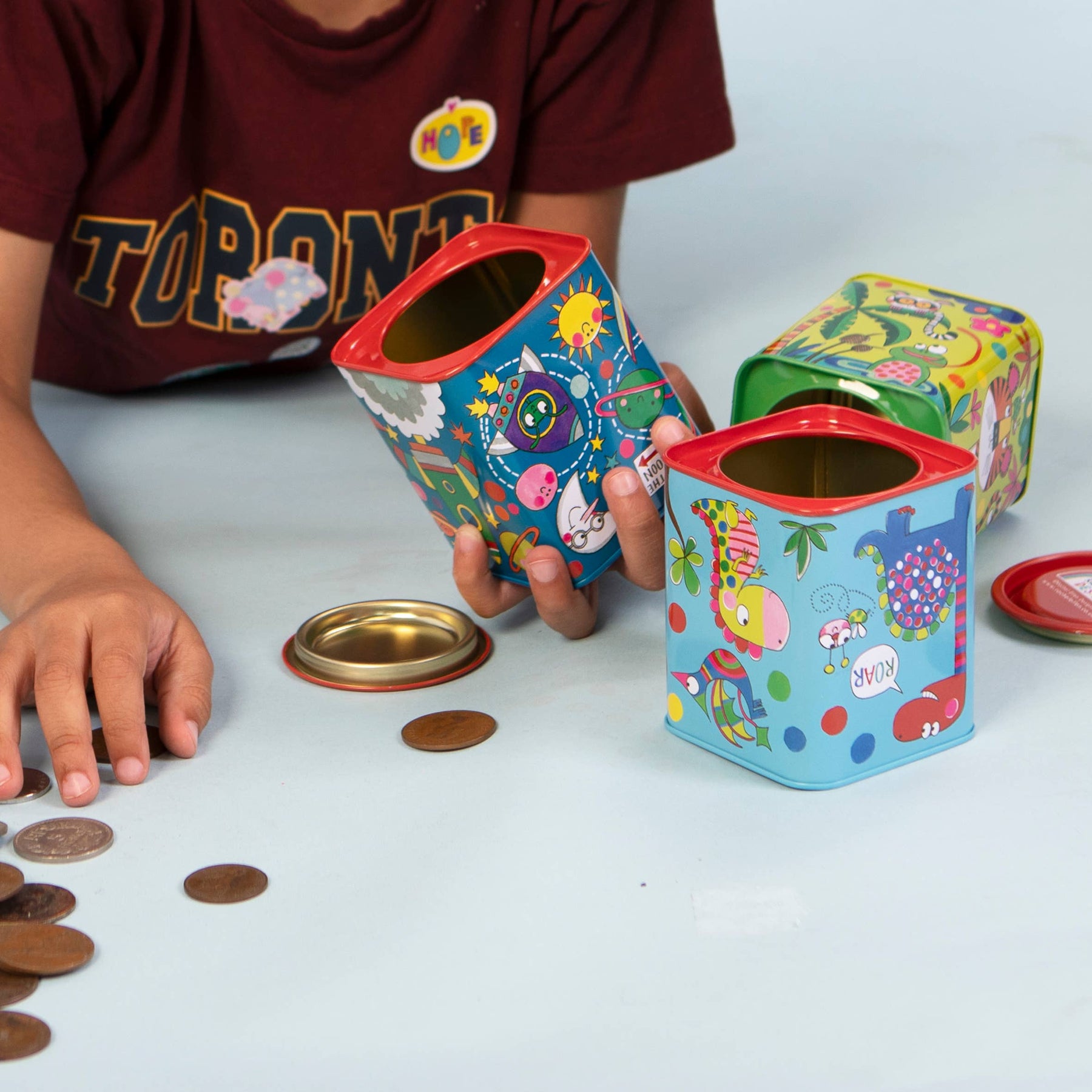This bestselling colourful money box tin features an 'Adventure Fund' jungle animal design. It has a slot in the top for coins and a removable tin base. SIZE: 92mm x 77mm x 77mm