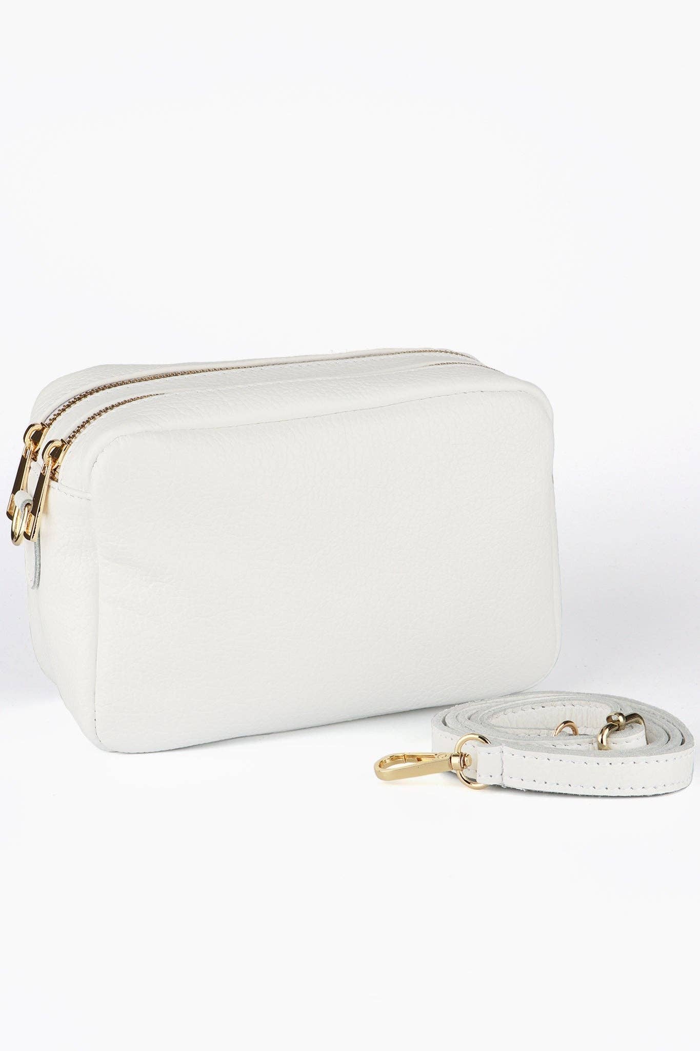 This plain white crossbody bag is crafted from genuine Italian leather. Featuring two compartments, zip closure and classic gold hardware. This luxurious bag includes a removable adjustable strap allowing it to be worn over the shoulder or carried cross body.