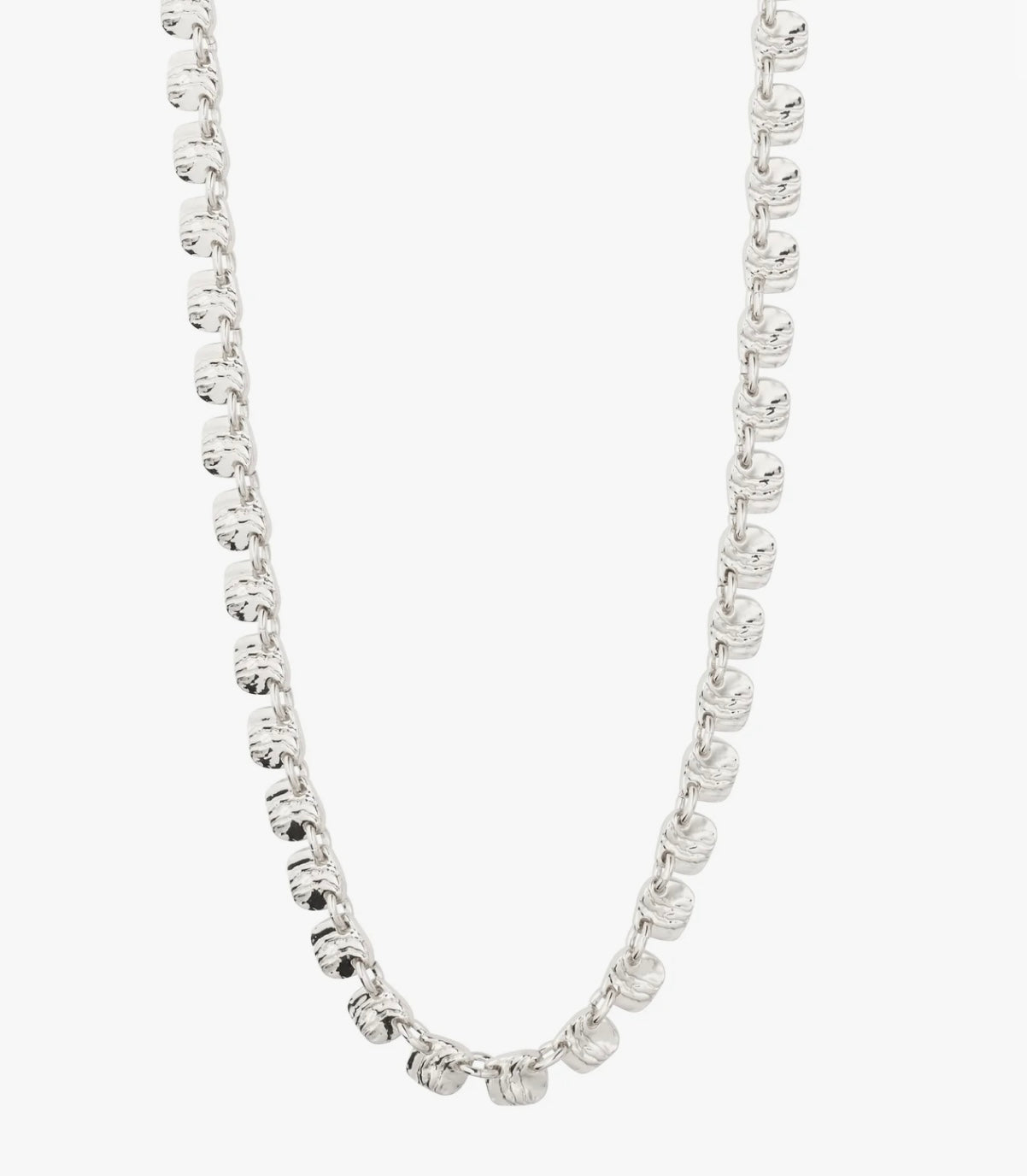 SENSE the vibe, express yourself! The silver-plated SENSE necklace from Pilgrim is a must-have for your jewellery collection – delicate with a cool twist. The small square coins with a rustic texture reflect light and add an effortless touch to your look. A dashing everyday piece that goes with everything! Wear it close to the neck for a minimalist feel and stack it with more of your faves for a personal and laid-back vibe. Perfect with a ribbed tank top and an oversized blazer for street-ready style. The necklace measures 38 cm + 12 cm extension chain and is made from 99% recycled materials – because style and thoughtfulness go hand in hand.