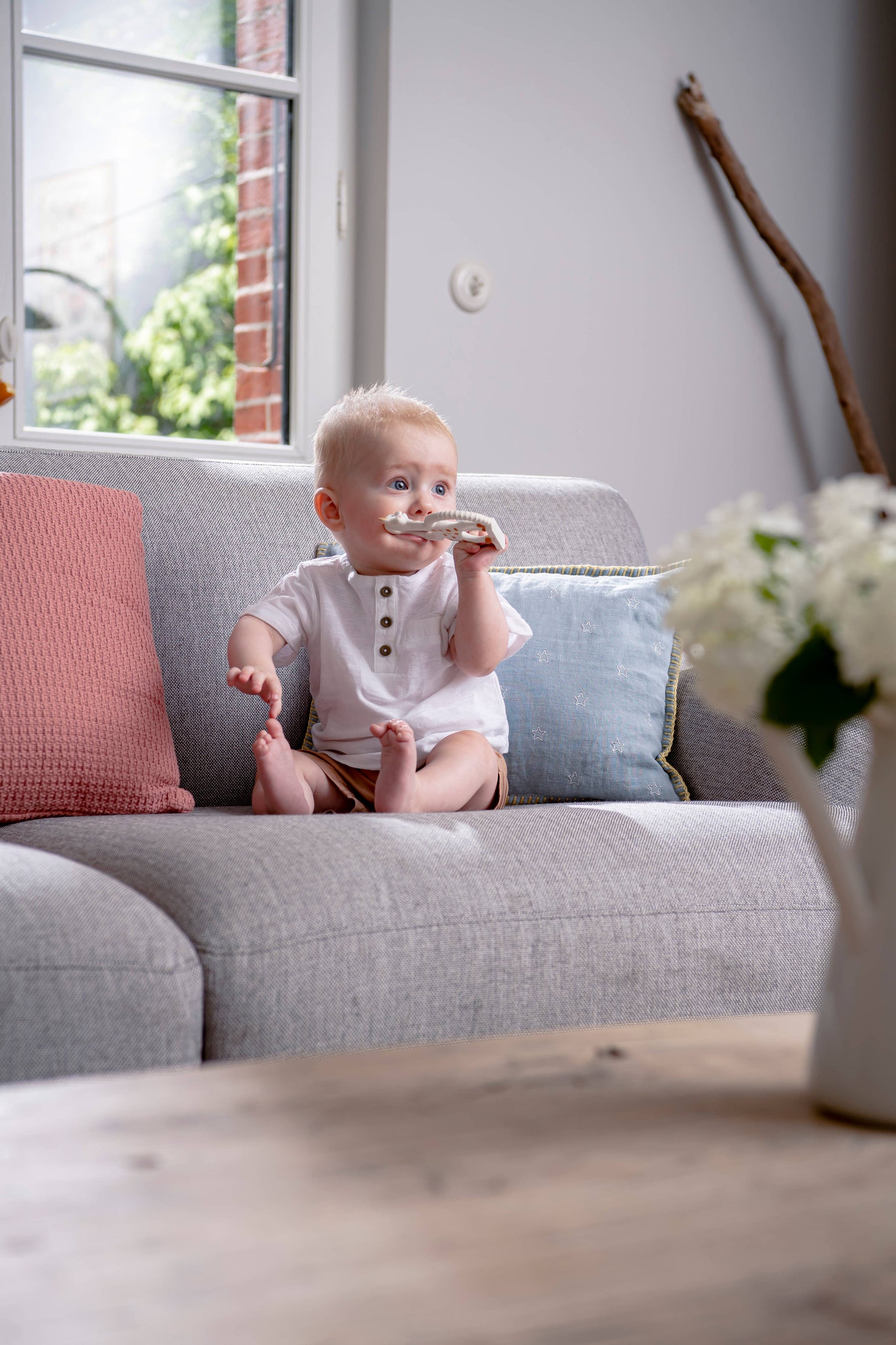 The first teething ring is made of 100% natural rubber. Made from the same natural rubber and food-grade paints as the original Sophie the Giraffe. Great for little hands to hold and ideal for soothing painful gums. Features a variety of textures to relieve baby at different stages of teething. 2 versions are available. Supersoft is a very soft flexible version to soothe the appearance of those very first teeth. Soft a firmer version for a more advanced teething stage.