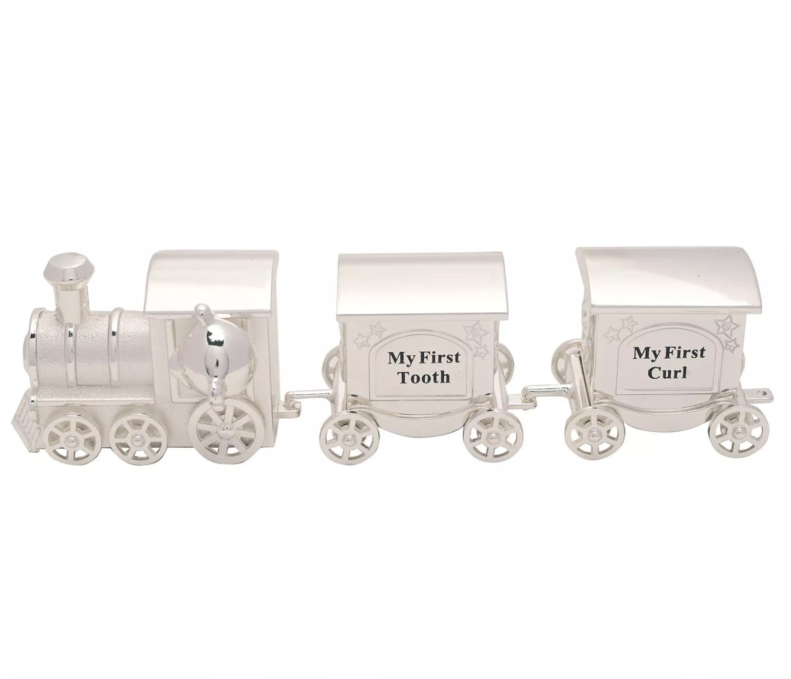 A stunning silverplated train set with first tooth and first curl carriages from CELEBRATIONS® Whether it's for a baby shower, first birthday, christening or just to welcome a newborn into the family, this keepsake train set will be treasured for many years. The two carriages are embellished with adorable motifs of teddy bears and labelled 'My First Tooth' and 'My First Curl'. With its timeless silverplated design, this keepsake box train set will look great on display in any home and is complemented with attractive, satin lined packaging.
