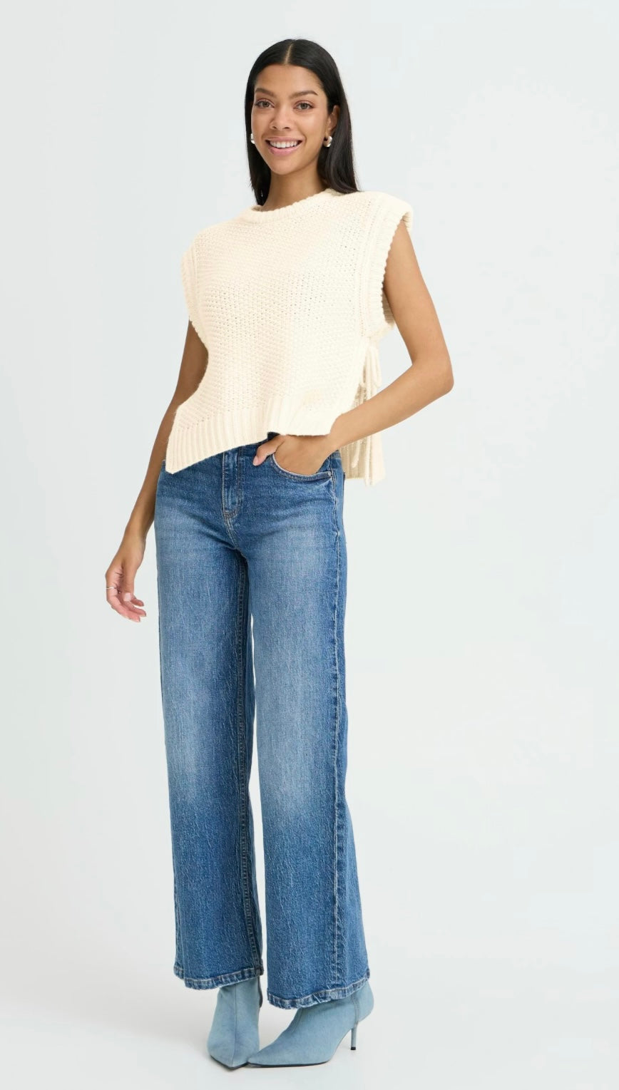 Knit vest features a boxy silhouette with wide shoulders and ribbed crew neckline. Armholes are finished with ribbed edges. Side tie details add a subtle accent. The texture has a visibly chunky knit appearance.