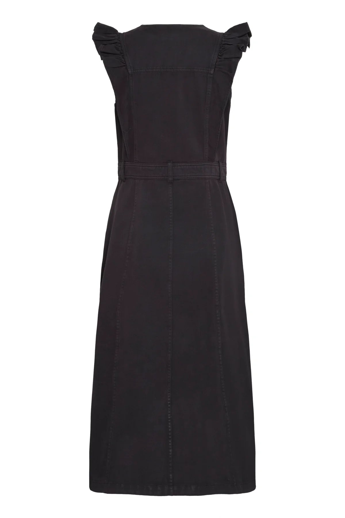 This B Young Kamilla Cotton Dress features a sleeveless design with a delicate frill edge, adding a subtle feminine touch. The half-button front allows for easy wear and adjustable styling. Tailored with a defined waist and belt loops, it offers a flattering silhouette. Practical front pockets enhance functionality without compromising style, making it a versatile choice for both casual and polished looks. Crafted from breathable cotton, it ensures comfort throughout the day.