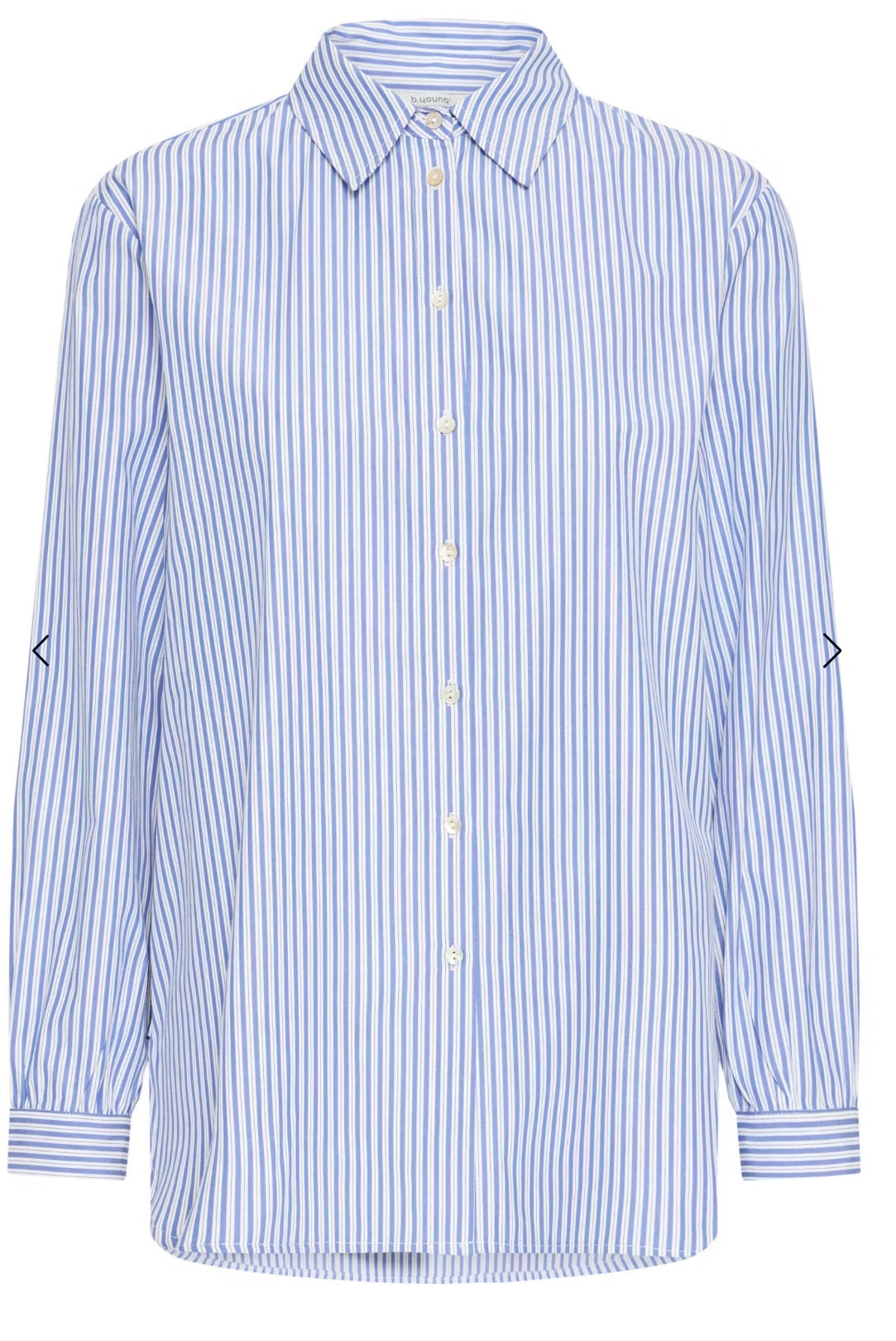 Striped shirt with a straight silhouette, classic collar, and full button placket. Features long sleeves with buttoned cuffs. Length reaches just below the hips, and the fabric has a smooth, structured appearance.