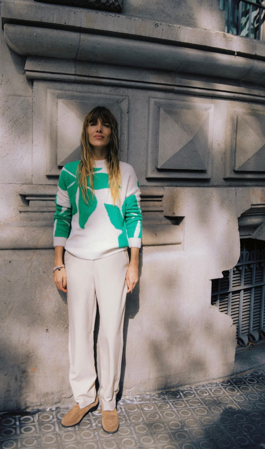 his knit pullover sweater features a straight fit with long sleeves and a ribbed crew neckline. The surface displays a tactile, softly textured finish. Its hem and cuffs are ribbed, providing a clean edge to the relaxed silhouette.