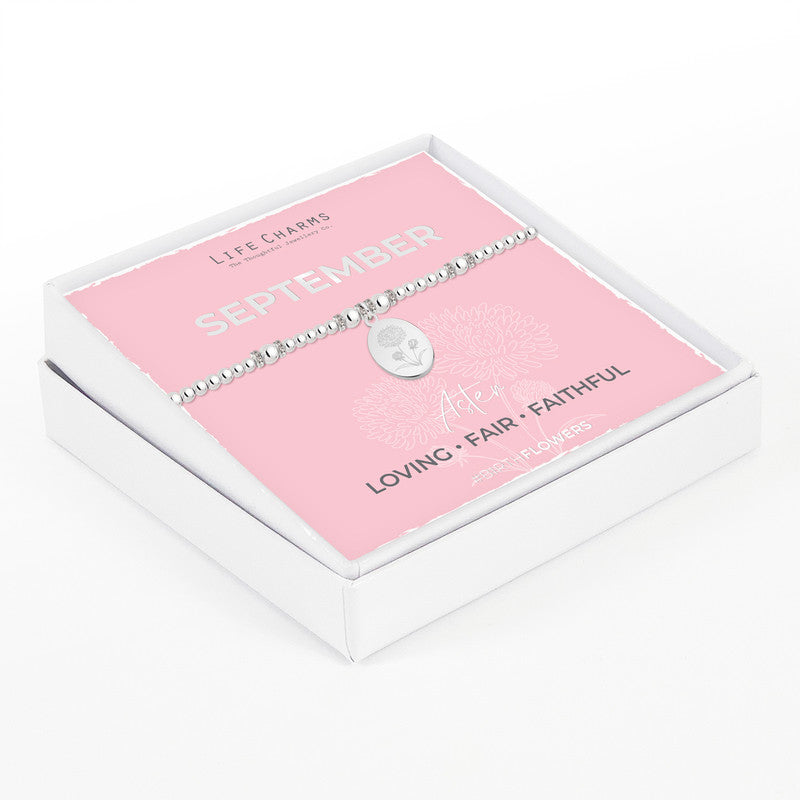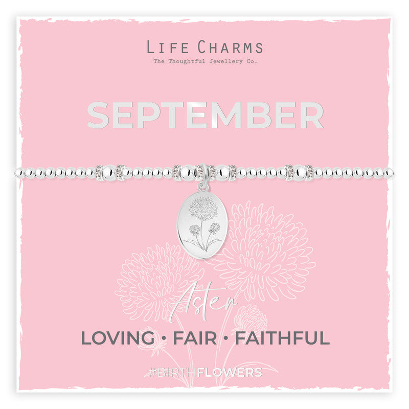 Silver beaded design and shimmering oval charm engraved with the outline a Aster - September birth flower.