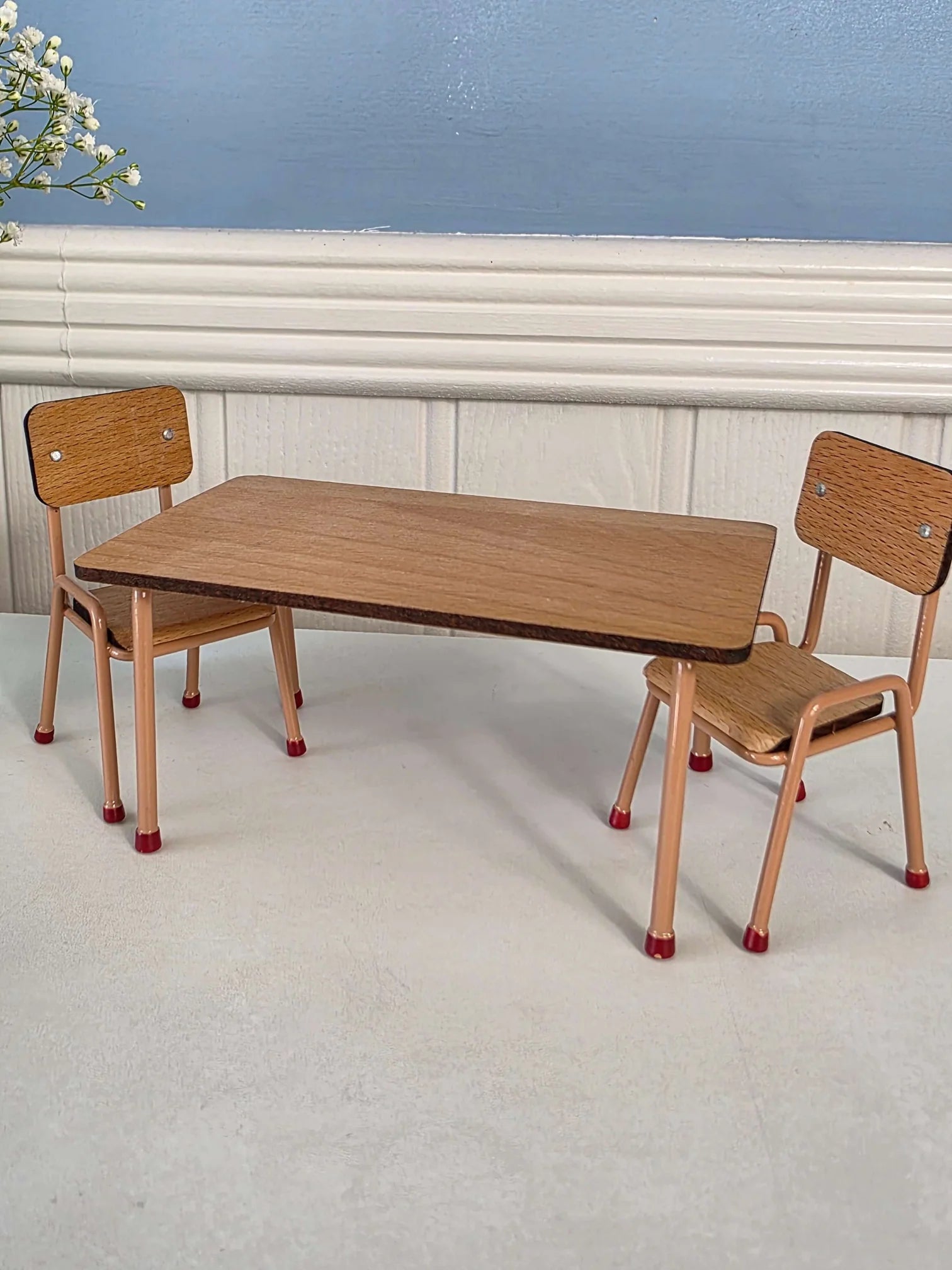 This Maileg table and chair set fits the Mouse hole Farmhouse. It is made in beech wood with metal legs. Please notice the handmade colour details on the feet of the legs - both on the table and the chairs. The set comes with 2 chairs and the table.