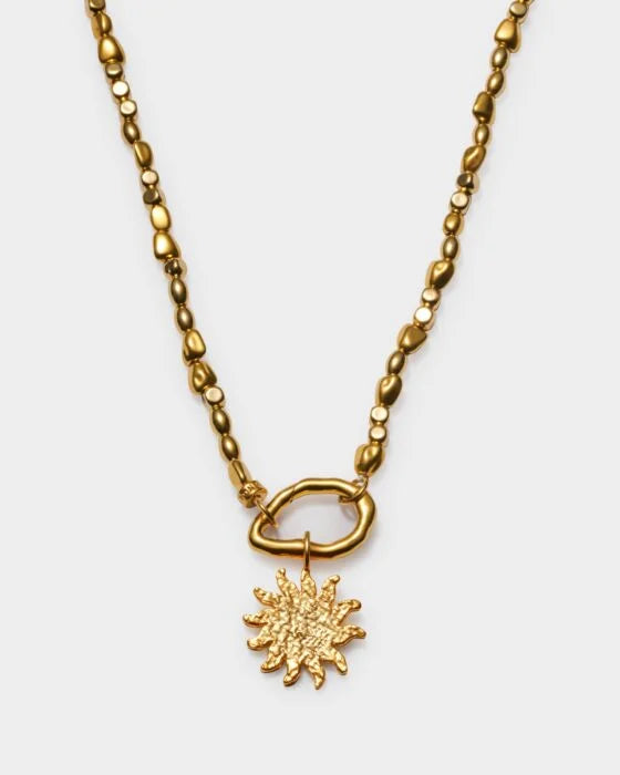 Our Golden Solesi Waterproof Gold Necklace is designed in durable 18K Gold PVD Coating, meaning it is waterproof, sweat-proof, and life-proof. Pairing smooth, rounded beads with a textured sun charm, it stands out beautifully on its own or paired with the rest of the collection for a coordinated look. Presented in a reusable suedette pouch, it's perfect for gifting or taking with you on the go.