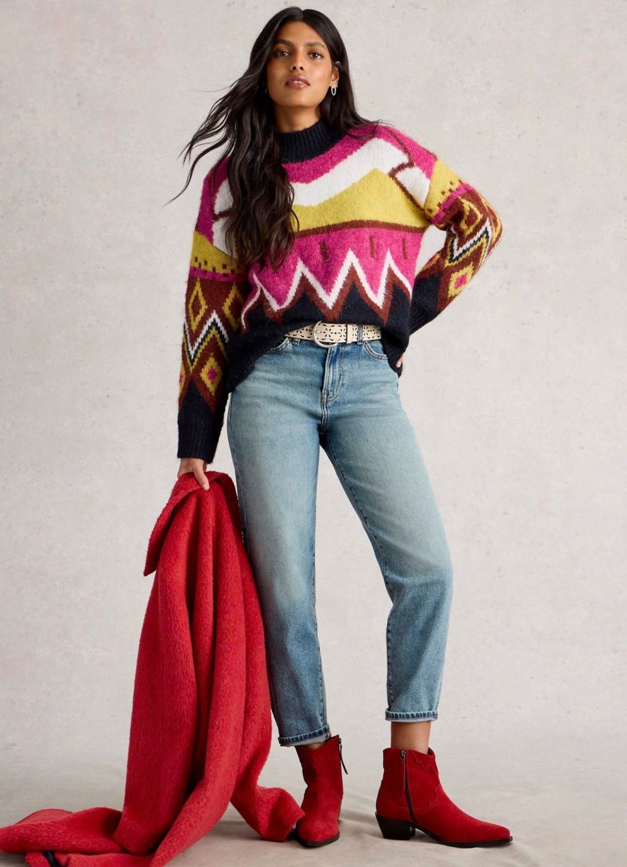 Bring a bold touch to your knitwear collection with this striking jumper from White Stuff. It's designed in a comfy regular fit, with a sloping mock neck for extra snugness. The piece features an eye-catching abstract pattern that's enhanced by the plain rib-knit trims. Dropped shoulders offer a slouchy silhouette.