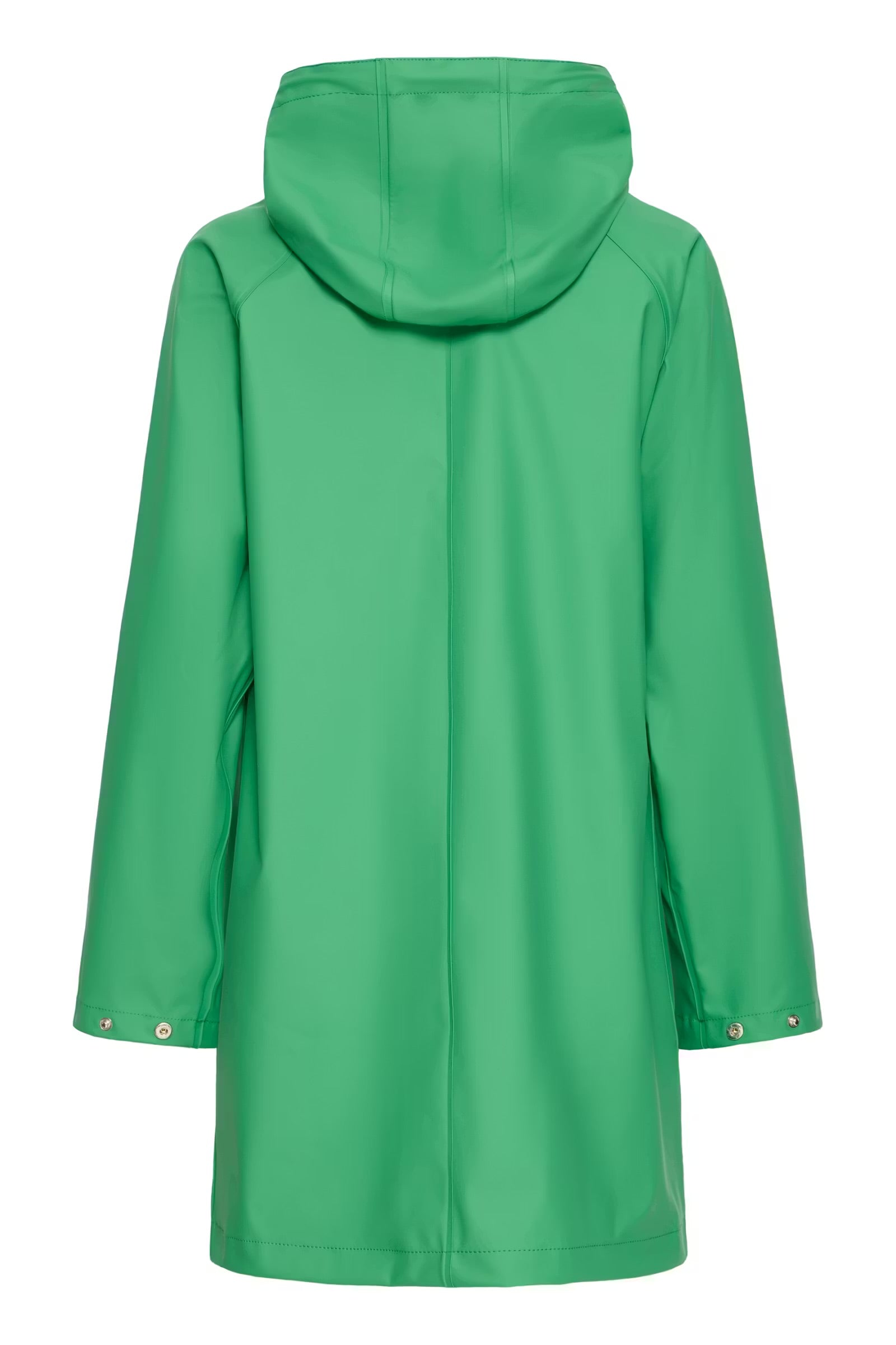 This rain jacket features a straight fit, a matte surface, and a generous hood with adjustable drawstring. Snap buttons close the front placket, and two angled flap pockets add practical structure. Long sleeves and a longer cut