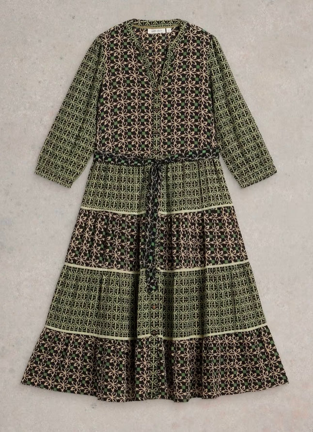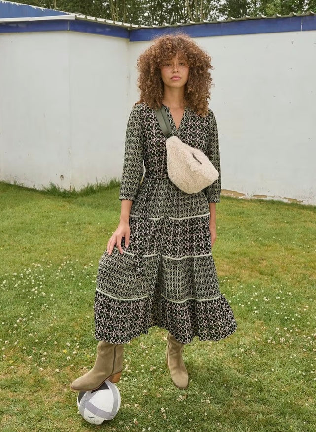 We don't know about you, but the artsy vibes of this printed, tiered dress kind of make us want to start collecting rattan furniture and giving folk music a go.