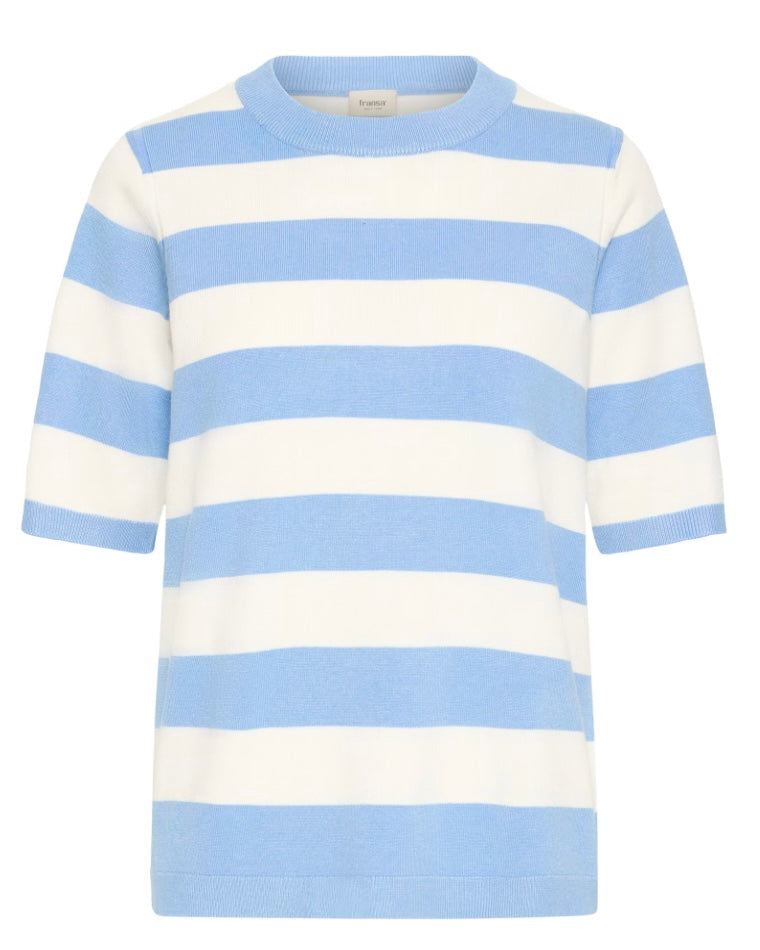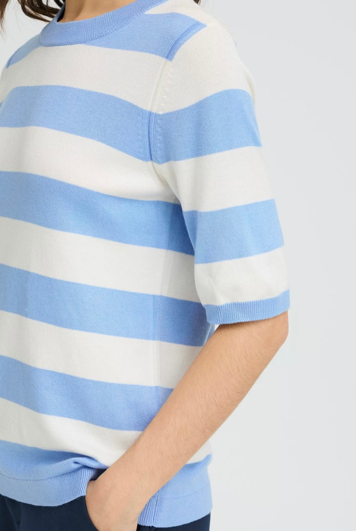 Short sleeve round neck knit top with a straight silhouette and soft texture. Ribbed neckline, cuffs, and hem create a streamlined, clean finish.