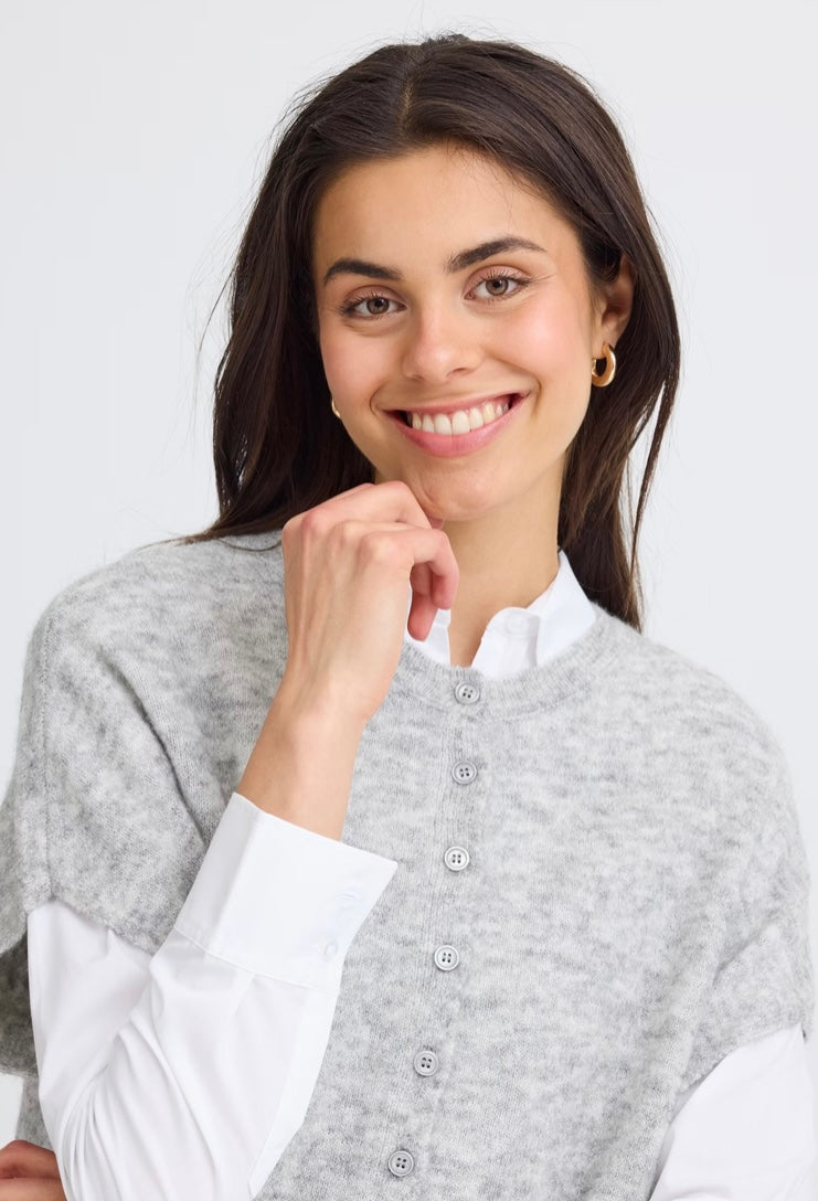 This women's button-up short-sleeve sweater top offers a relaxed fit and soft texture. Features a round neckline, front button closure, and comfortable silhouette, ideal for versatile, everyday outfits.