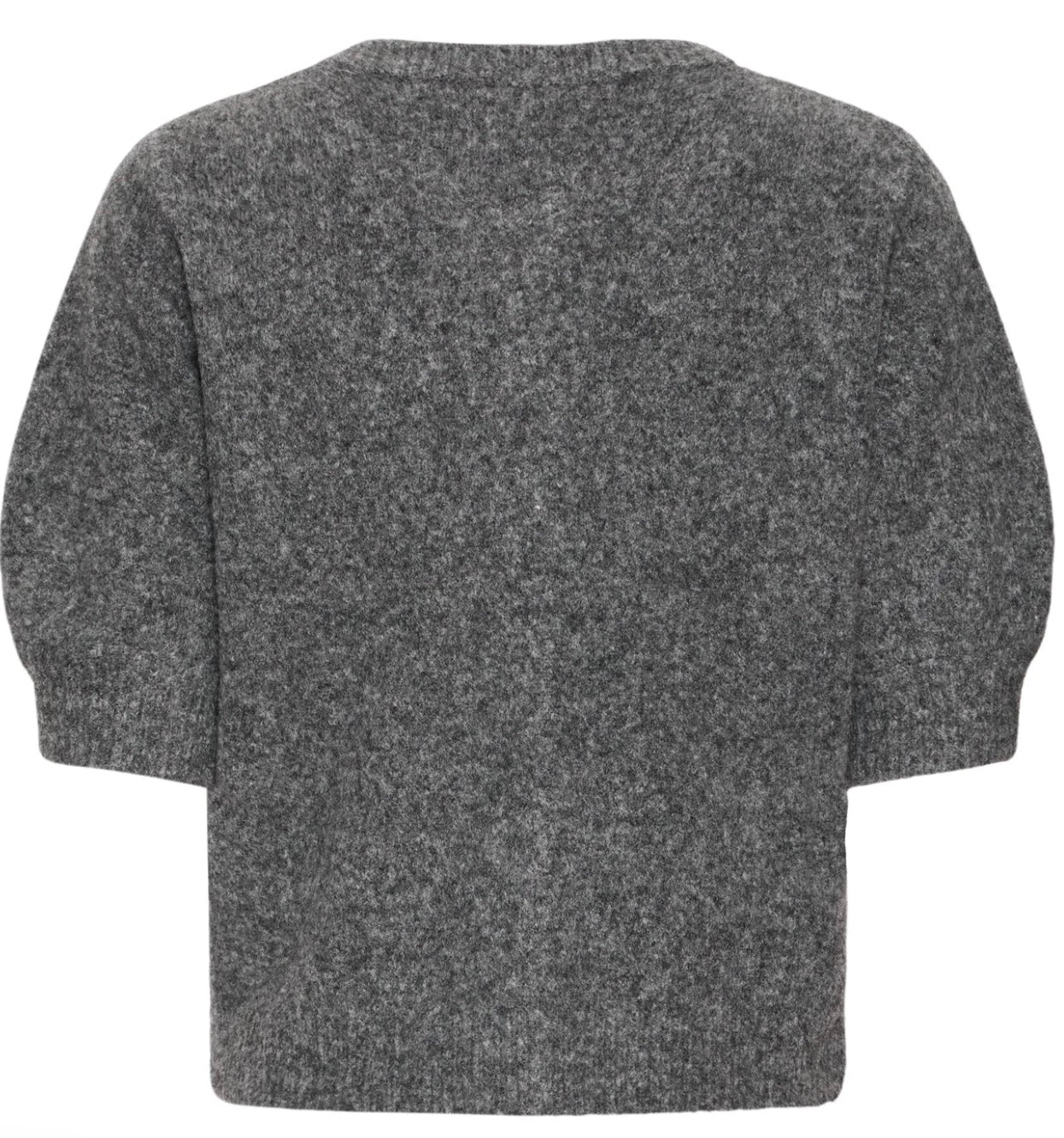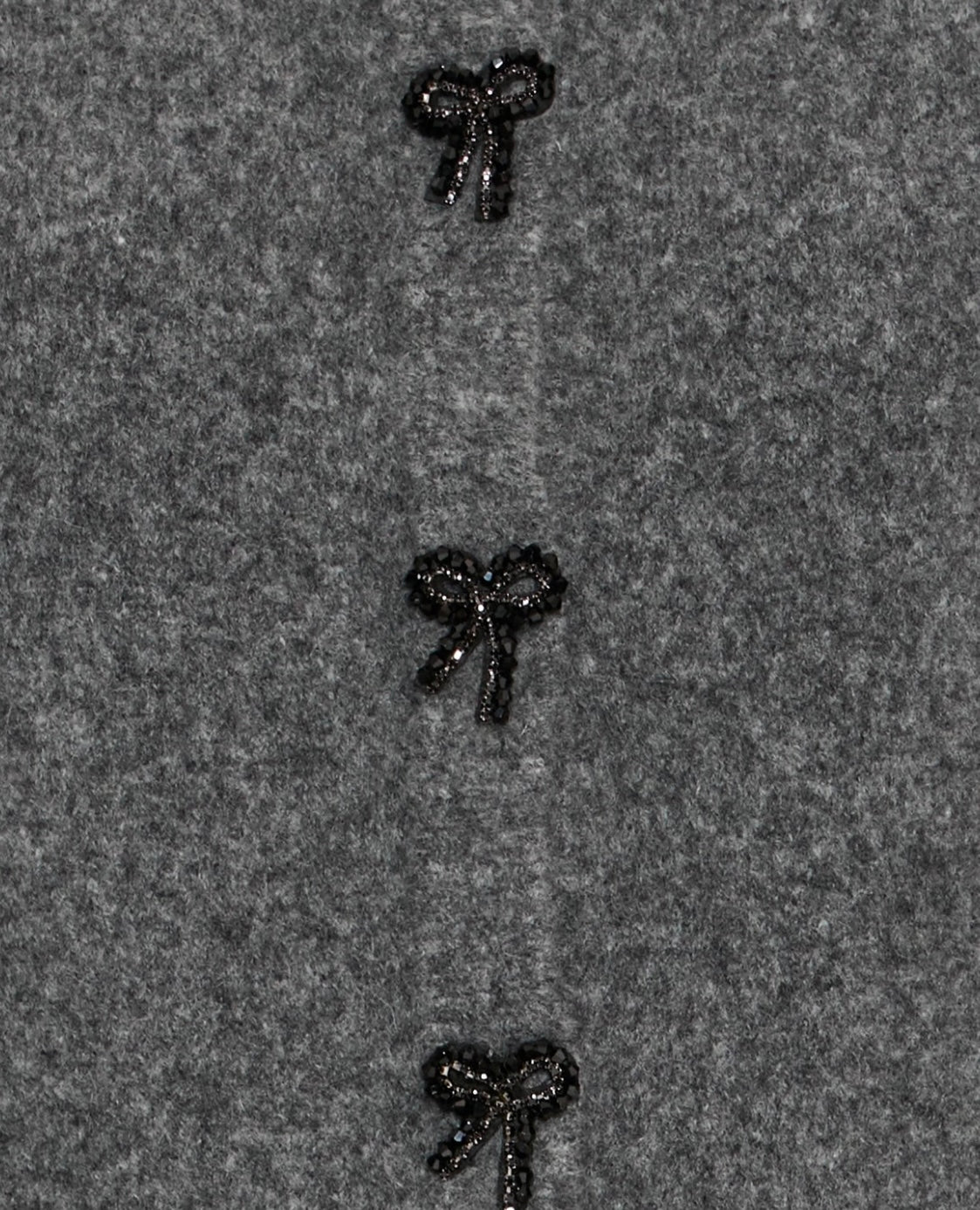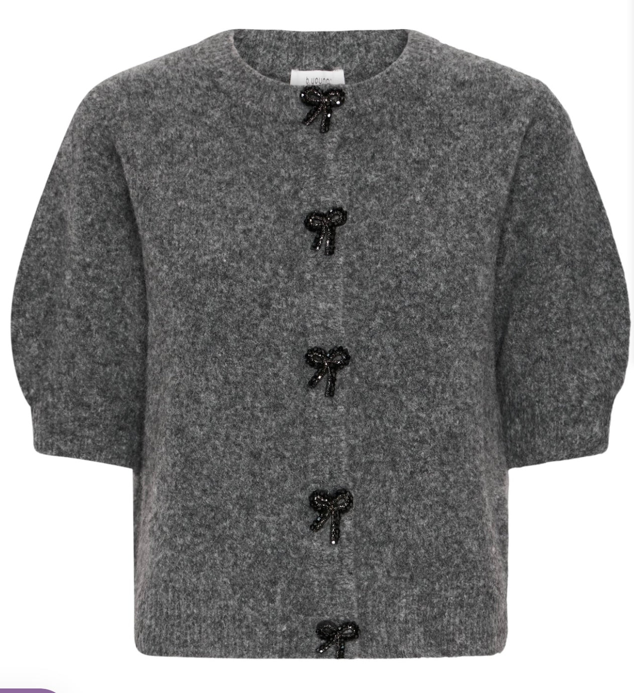 Cardigan sweater with relaxed fit and round neckline. Features half sleeves and decorative bows as button closures. Soft knit offers daylong comfort and versatile styling for any occasion.