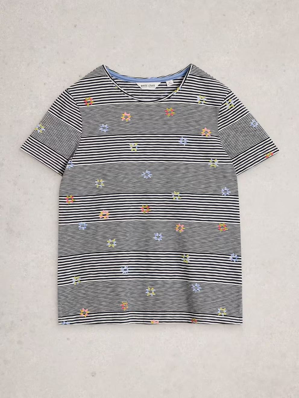 A crew neck tee with multicoloured stripes. Sure to brighten up any day.