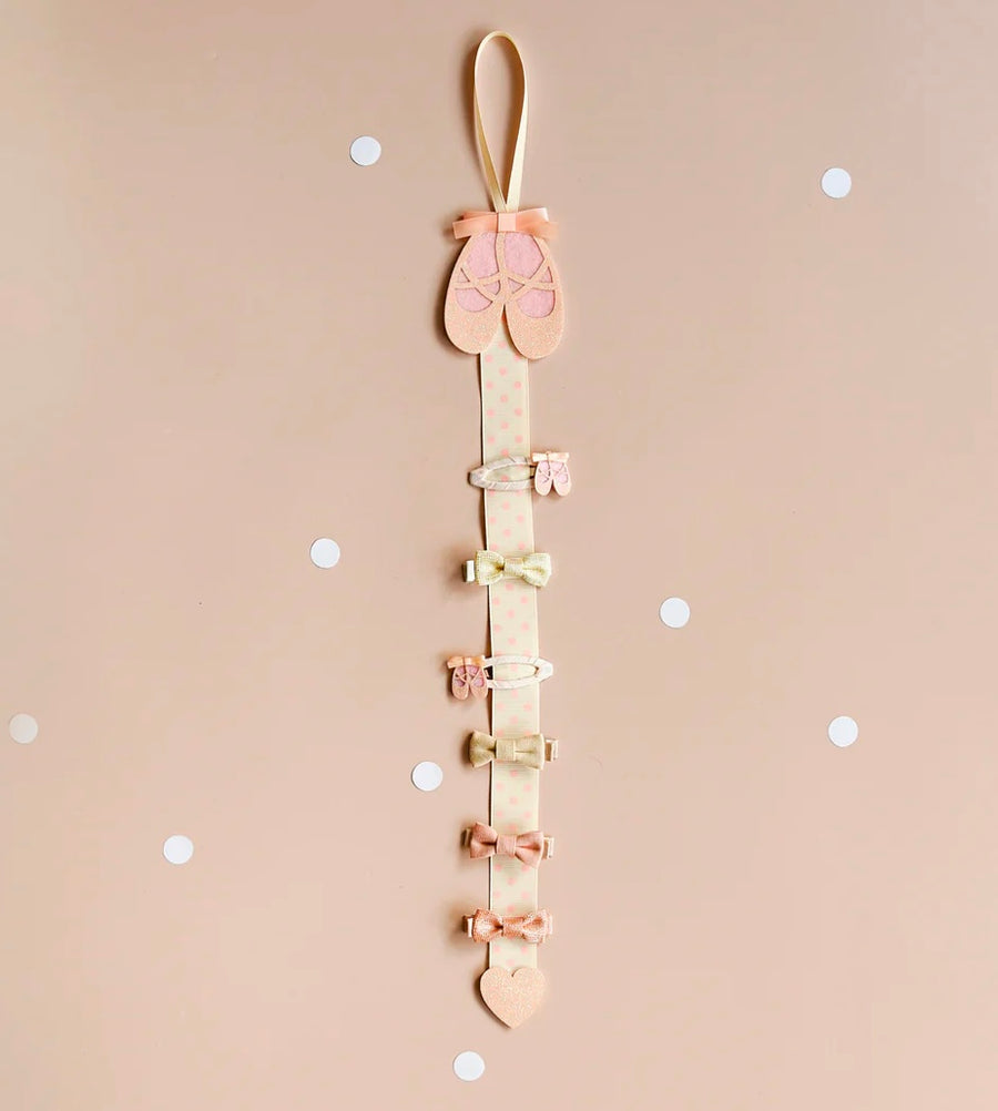 The perfect solution to storing and organising hair clips in one place - our clip hanger has a hanging loop that can be hung on a door or wall hook. Simply snap on your clips ready to wear again next time! Featuring two pretty little ballet slippers in soft pink glitter with a beautiful little pink bow and a love heart at the bottom of the hanger, our ballet clip hanger can fit around 12 clips (depending on clip size) and hangs perfectly on a spotty grosgrain ribbon! *Clips not included!