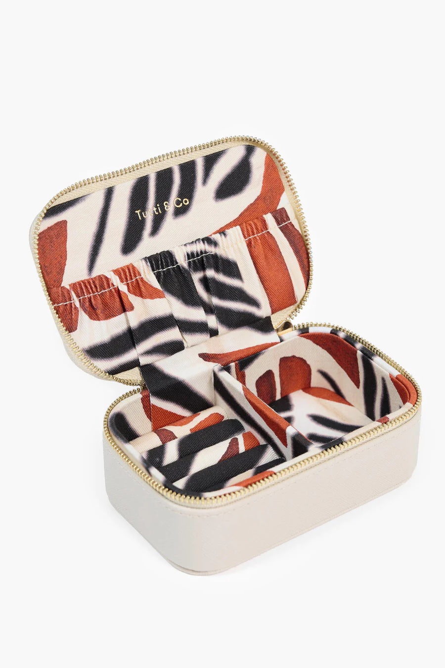 Featuring an off-white leather outer with gold printed branding and multiple interior compartments for your best-loved rings, necklaces, bracelets and more.