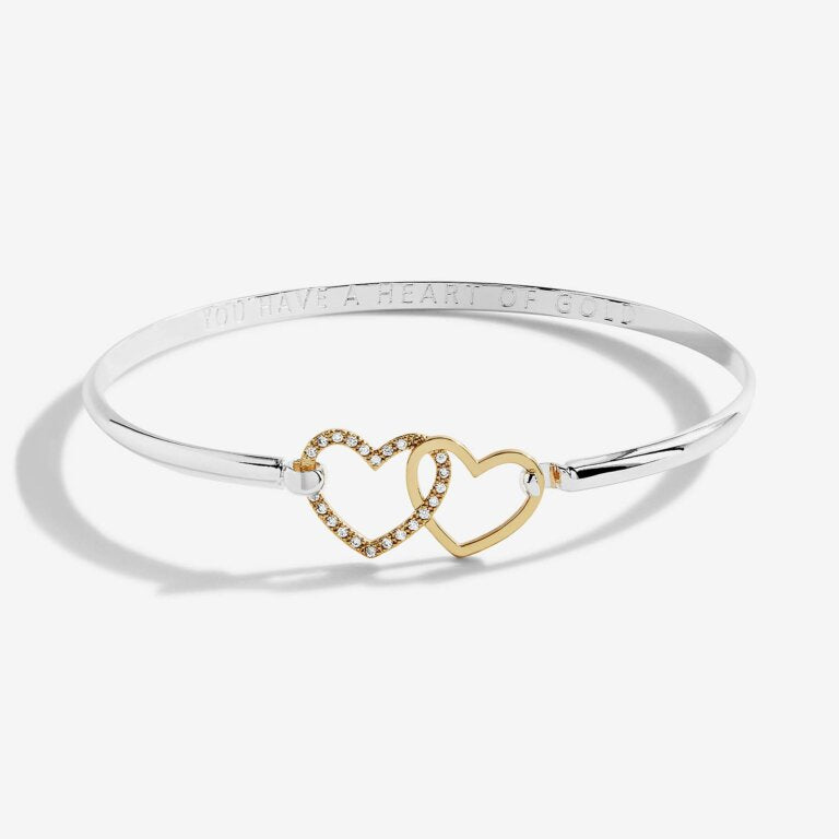 This bracelet bar features a gold-plated chain with gold and silver interlocked heart charms, pavé crystals, and complete with the engraved sentiment 'You Have A Heart Of Gold'. The perfect gift to mark every milestone occasion or commemorate a special anniversary.