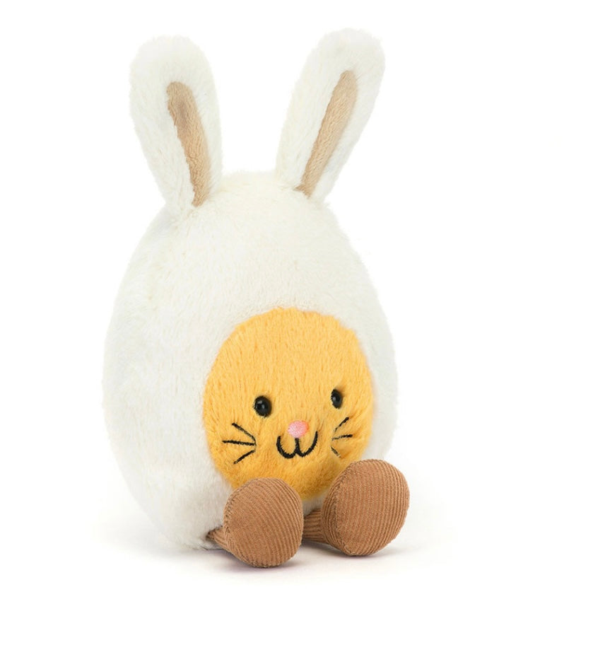 Amuseables Bunny Egg is all dressed up for the Easter hunt! Soft and sweet in cream and yellow fur, this boiled egg bunny has long cream ears with beige insides, and embroidered whiskers and nose. This perfect pal has fine cord legs to run around to find Easter eggs.