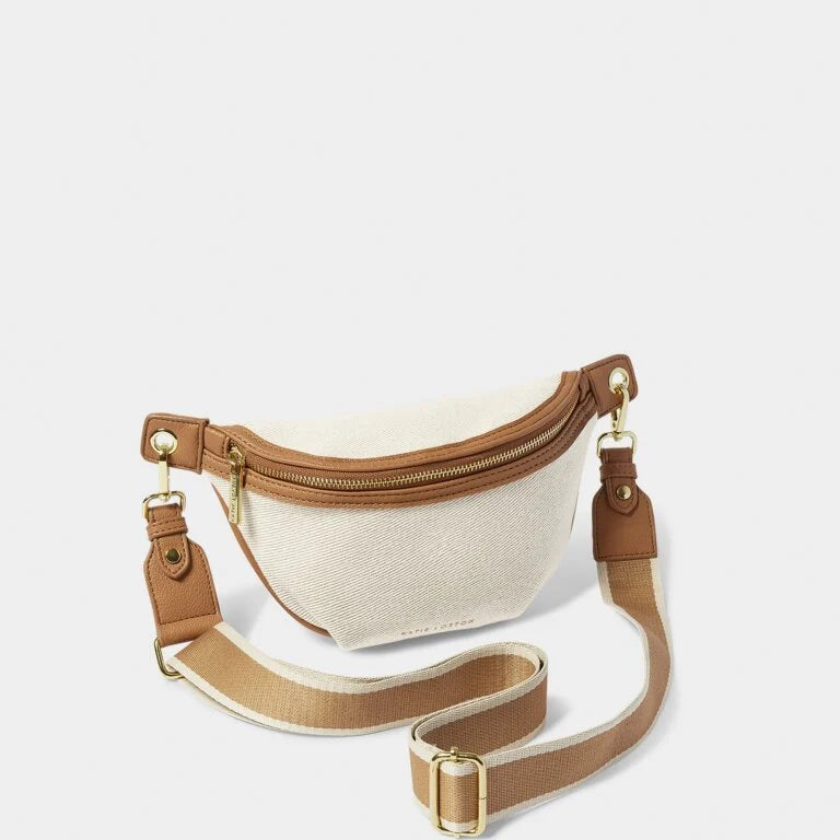 Say hello to your new summer staple; our Capri Canvas Belt Bag in Tan & Off White. Designed in durable canvas with vegan leather details, this sunshine-ready style features an adjustable crossbody strap to ensure the perfect fit, while the internal zip pocket helps to organise small essentials. Complete with luxurious Katie Loxton branded hardware, You can seamlessly match this style with our other Capri Canvas Accessories, creating a coordinated look.
