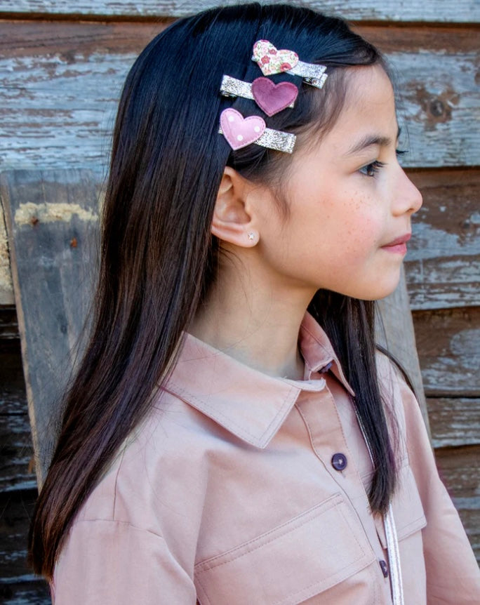 Feel the love with this sweet set of heart bar clips in our Caravan story colour palette. Featuring three hearts in our Margot floral print, a spotty pink fabric and dusky velvet! Each set onto a glittery bar clip - they are loveable in every way!