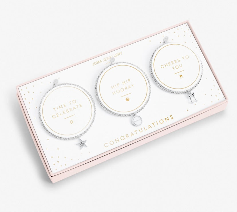 It's time to celebrate! Our 'Congratulations' Celebration Set is the perfect gift for those extra special occasions. Featuring a set of 3 gorgeous bracelets, each with a silver-plated design, unique charm and sweet sentiment. Perfectly packaged in an elegant gift box, making the most captivating addition to every jewellery collection.