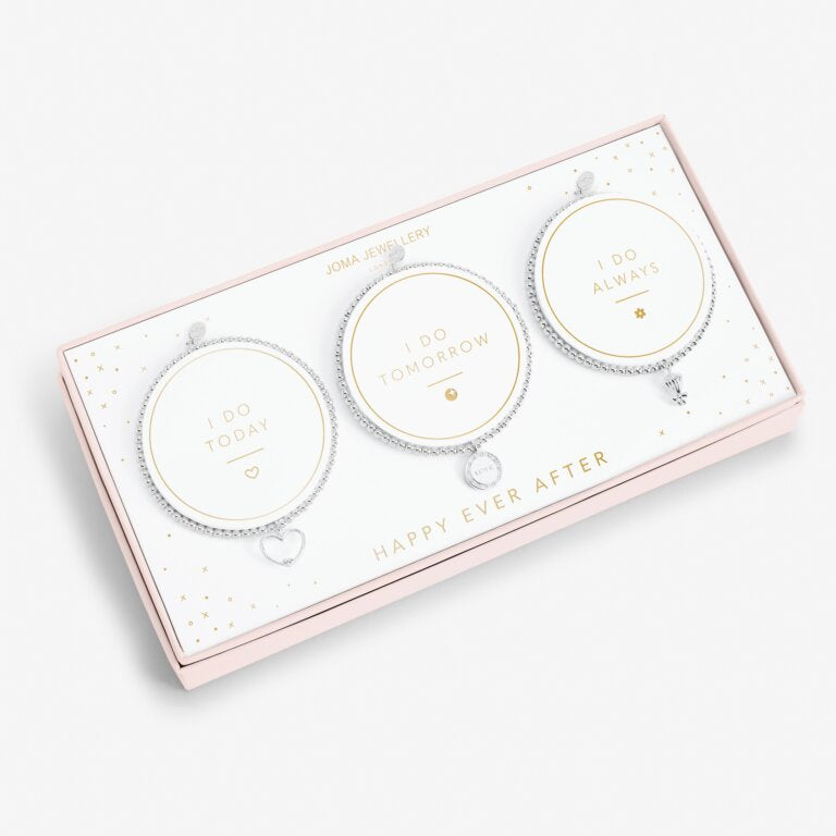 It's time to celebrate! Our 'Happy Ever After' Celebration Set is the perfect gift for every bride-to-be. Featuring a set of 3 gorgeous bracelets, each with a silver-plated design, unique charm and sweet sentiment. Perfectly packaged in an elegant gift box, making the most captivating wedding or anniversary gift.