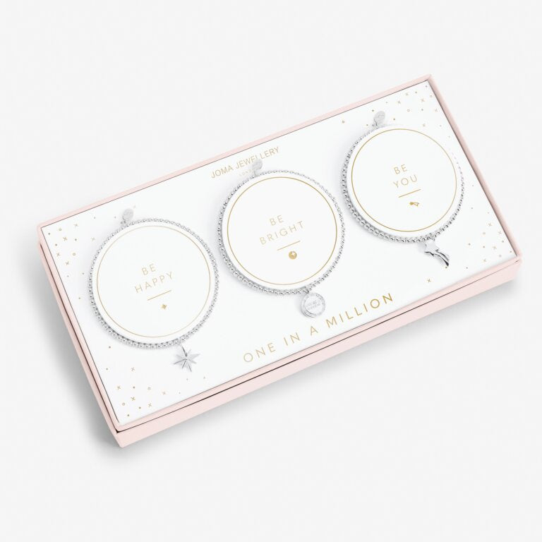 It's time to celebrate! Our 'One In A Million' Celebration Set is the perfect gift for those who mean the most. Featuring a set of 3 gorgeous bracelets, each with a silver-plated design, unique charm and sweet sentiment. Perfectly packaged in an elegant box, the most heartfelt gift for any special occasion.