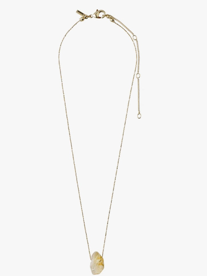 Chakra: The Solar Plexus. A piece of beautifully shaped yellow citrine forms the pendant of this gold-plated necklace. The golden semi-precious stones are said to provide internal strength, protection and increase self-confidence. The chain is 40 cm long and it has a 9 cm extension chain, so the pendant hangs beautifully on the chest. Let the stone’s positive energy unfold at your heart, and enjoy its natural beauty. Please note: Each stone is unique and therefore there will be slight variations in shape and hue.