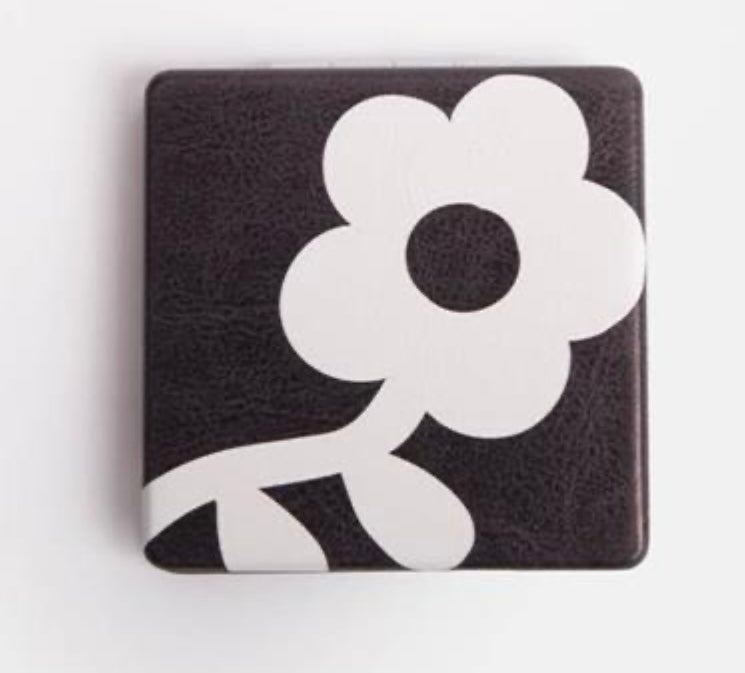Square pocket mirror in branded card box packaging. The hinged magnetic closure keeps it secure and opens up to reveal two mirrors - one with magnification, great for all those on-the-go makeup touch-ups.
