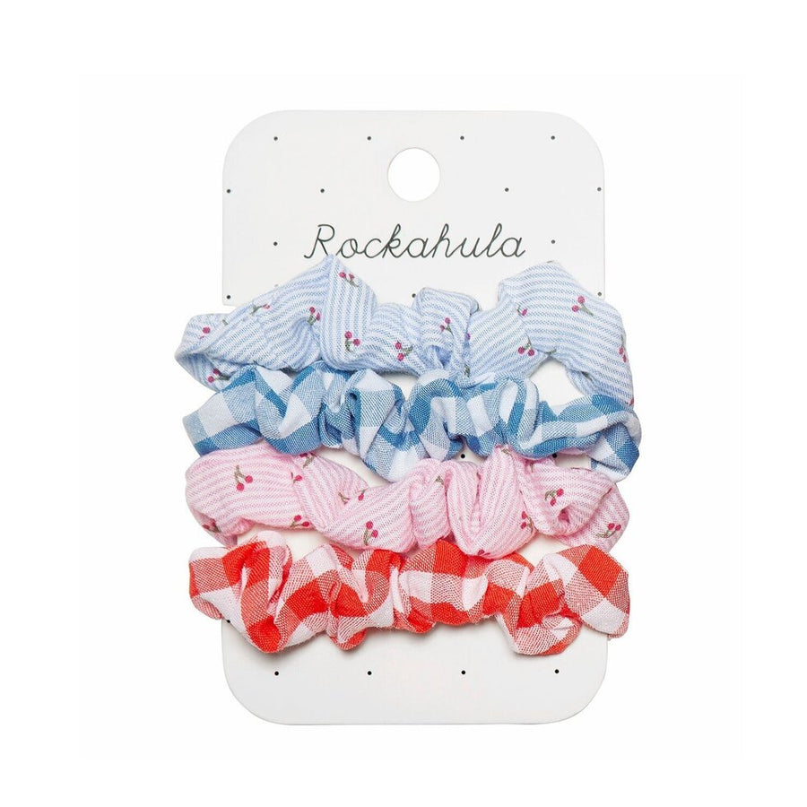 A pack of four sweet and wearable scrunchies, each in a different beautiful fabric. Featuring our striped cherry print in both blue and pink and our bright gingham fabric in blue and red.