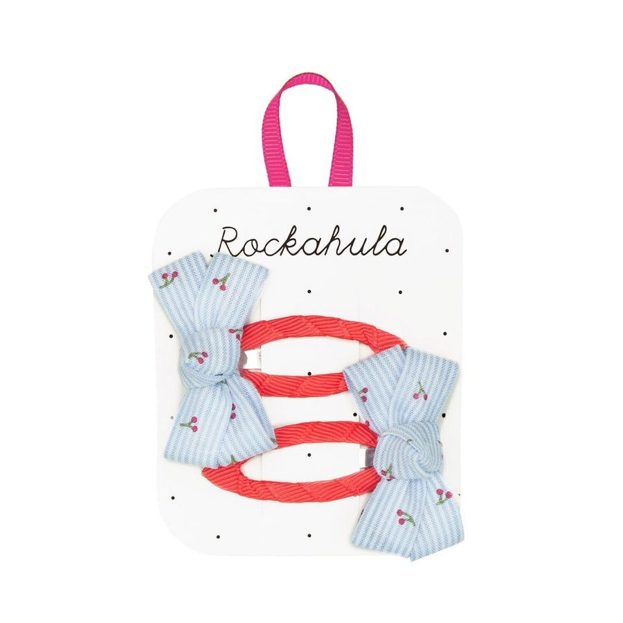 This set of two hand-tied bows are made from our sweet blue striped cherry fabric.