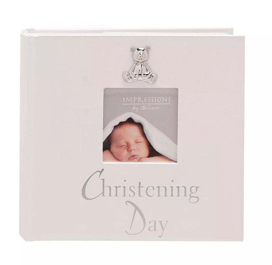 The album is white in colour and embellished with a cute silverplated teddy bear alongside the words: Christening Day on the cover. The album holds 80 photographs measuring 6" x 4" and the cover can be personalised with a photograph to front the album. With its neutral design, the album is suitable for either boy or girl.