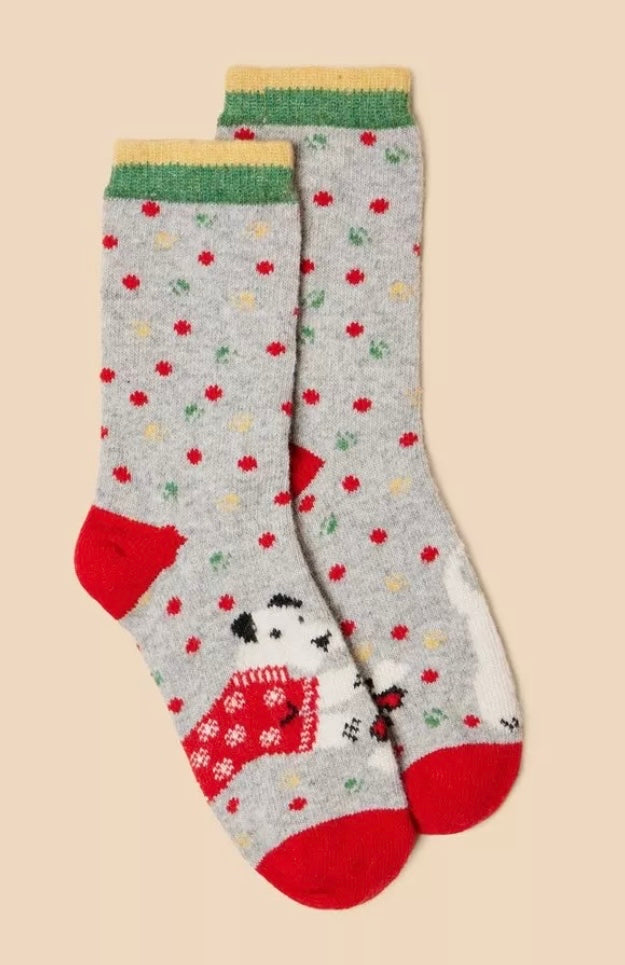 Soft and cosy socks featuring a dog in a jumper. Talk about puppy love.