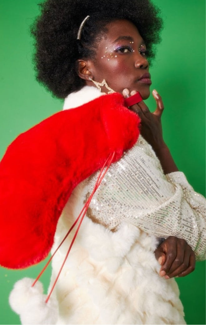 CLASSIC FAUX FUR STOCKING WITH WHITE POM POMS