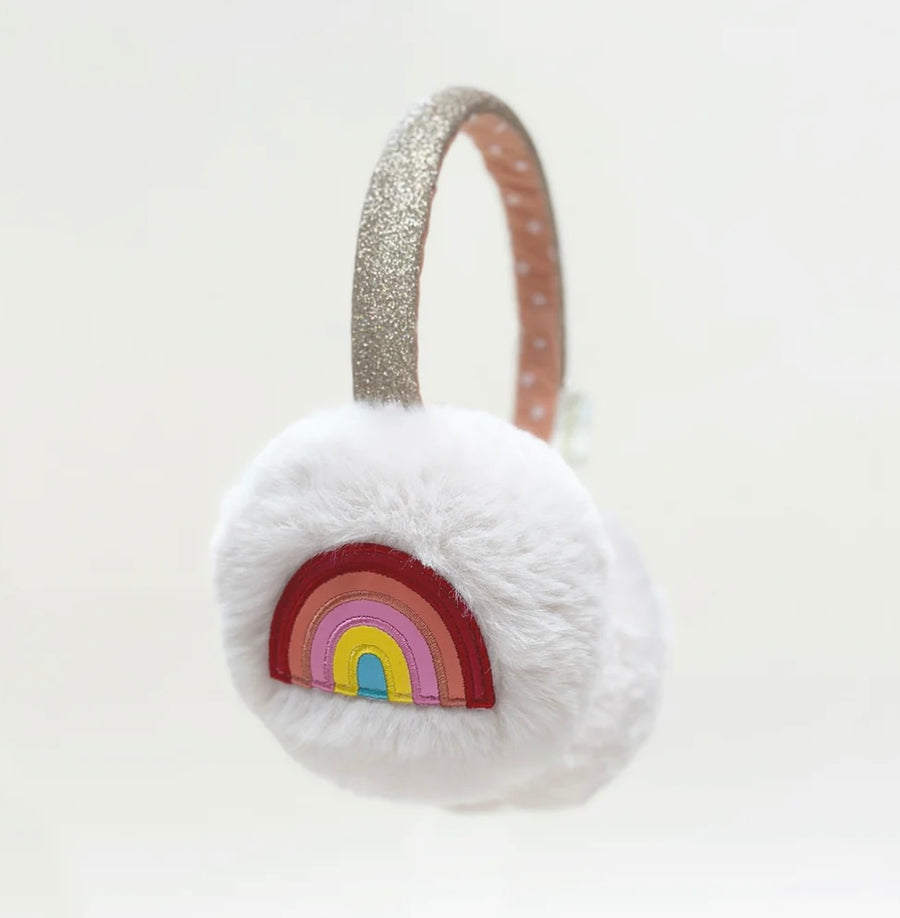 Keep it colourful and cosy with these fun earmuffs! Made with super-soft ivory fur and detailed with a bright rainbow appliqué. A comfort fit adjustable band covered in gold glitter make these the perfect earmuffs this winter!!