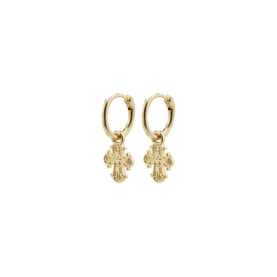 Small gold-plated huggie hoops with mini Dagmar Crosses, made of min. 75% recycled material. The Dagmar Cross is considered one of Denmark’s greatest treasures, and is the closest thing we have to a national jewel. There is a Danish tradition of giving the Dagmar Cross as a christening or confirmation gift – the beautiful symbol can be worn in all contexts. Pilgrim has reimagined the classic pendant and combined it with a pair of small gold-plated huggie hoops for an updated, cute look.