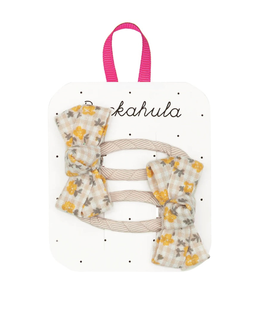 A beautiful set of two hand-tied bows made from our ditsy gingham fabric. Both are set on to mink grosgrain ribbon wrapped snap clips.