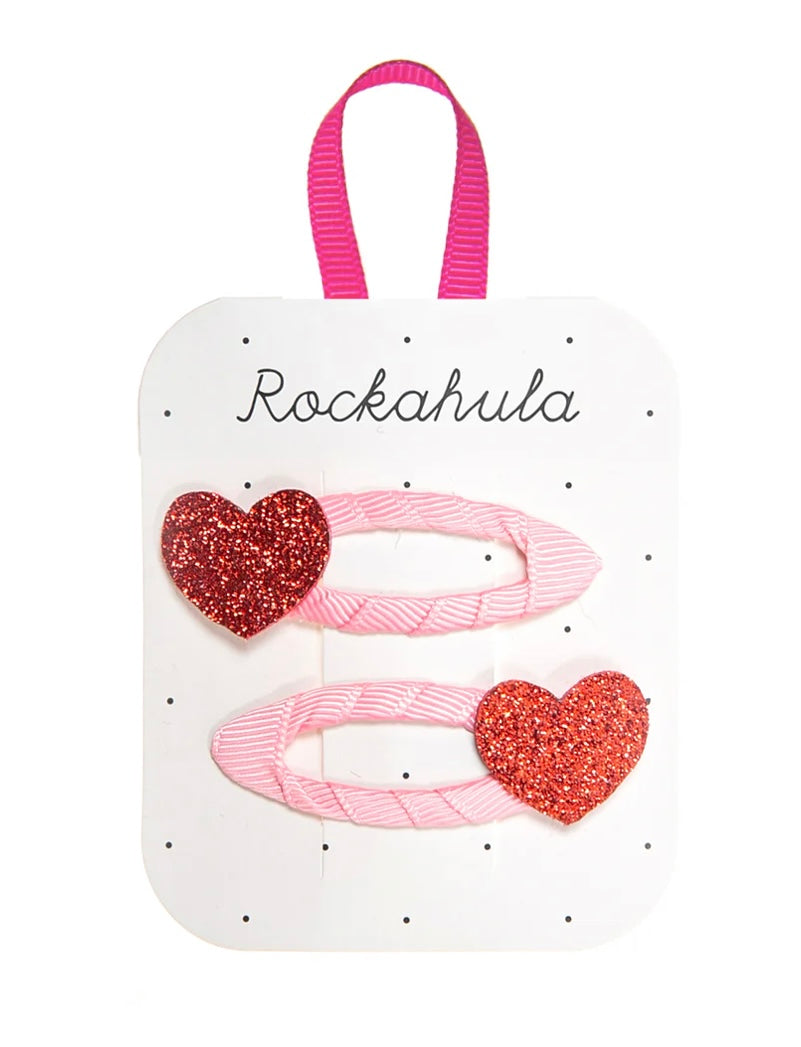A pack of two scarlet red glittery hearts, set upon pretty pink grosgrain ribbon wrapped snap clips. These glittery heart shaped clips are loveable in every way!