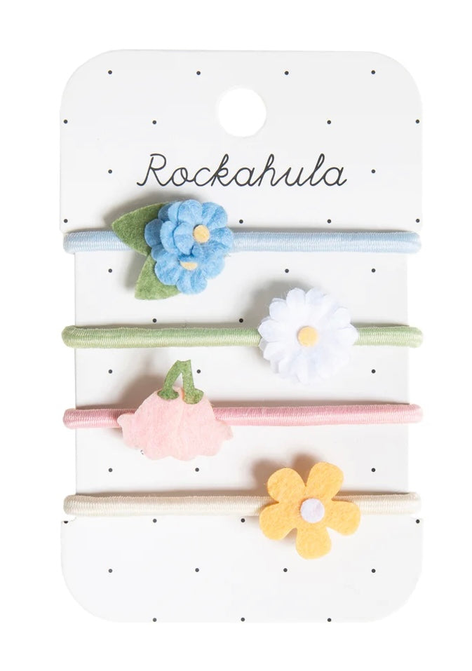 Add a posy of beautiful wild flowers to your hair with this pack of four pastel coloured elastics - a soft yellow primrose, our dainty daisy, beautiful blue forget me nots and pretty pink bluebells.