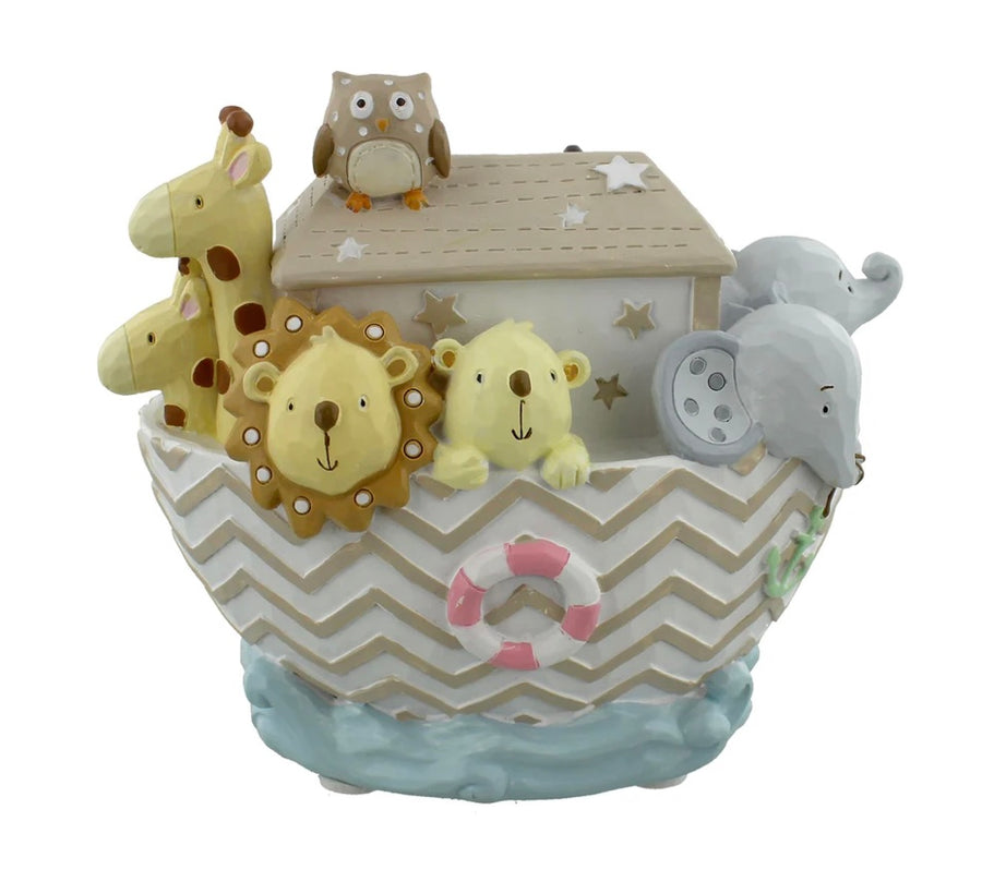 This beautiful money box makes for a great addition to any home. As a cute decorative piece for a nursery or bedroom, build up that new toy fund in this adorable Noah's Ark themed Money Box. With its neutral colours, this money bank is an ideal gift for either a baby boy or girl. The boat is bursting full of all of Noah's colourful animals, and has a wonderful and whimsical design sure to get baby's attention and will look fantastic on display.