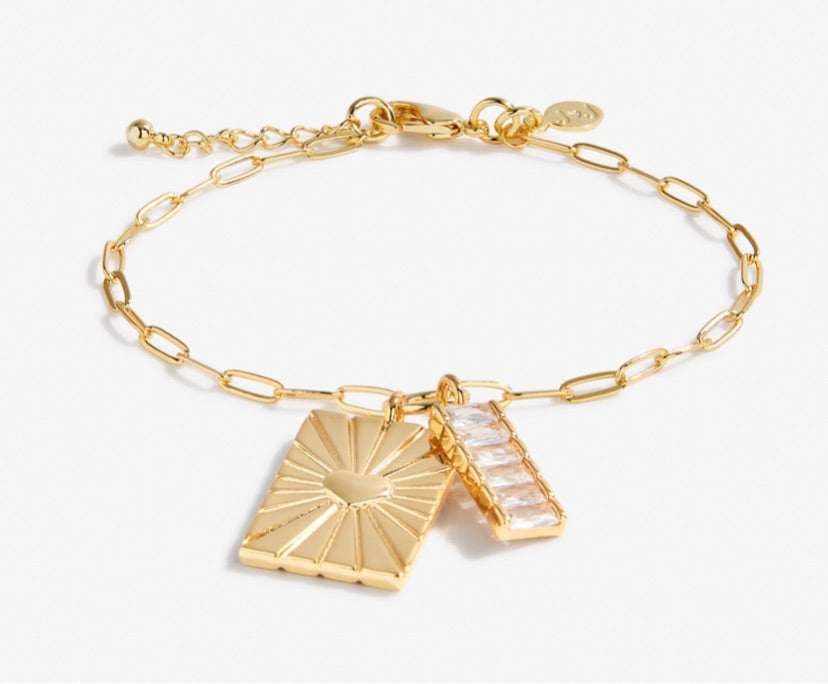 Made to be treasured for a lifetime. Our Nova Heart Cluster Bracelet features a delicate gold-plated chain, a lobster clasp fastening and two sparkling hanging charms. With one crystal embellished charm and one gold heart symbol charm. Bold enough to wear alone or paired perfectly with the matching necklace.