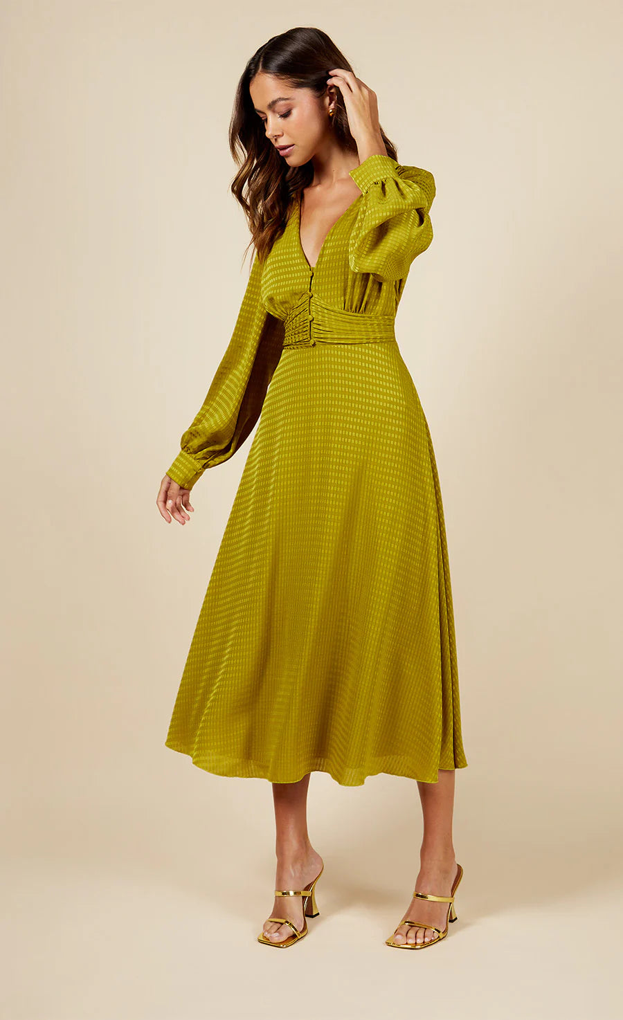 It's giving 70s vibes with a modern twist. Designed in a luxe olive textured chiffon, a gathered, buttoned waistband, V-neckline and voluminous skirt elevate the classic tea dress. Style with a platform boot for a full-on 70's look or opt barely there heels for a more subtle statement!