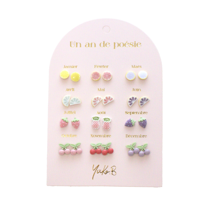 A card of 12 pairs of pierced earrings, based on the Fruity theme, to change over the months of the year.