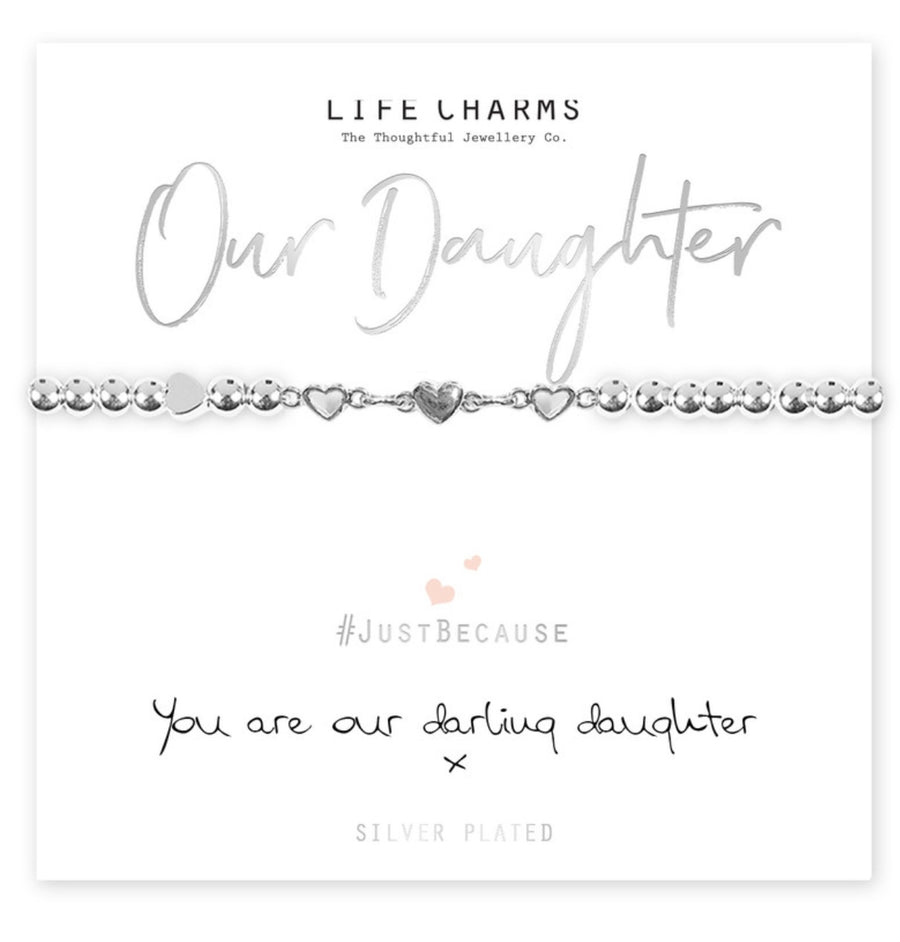 Two pure silver plated open heart charms and one solid heart charm, presented on a 5mm silver plated beaded stretch bracelet. The bracelet comes on a #Just Because card with 'You Are Our Darling Daughter' printed on it and presented in a luxury gift box. All jewellery is finished to the highest standard and e-coated to prevent any tarnishing.